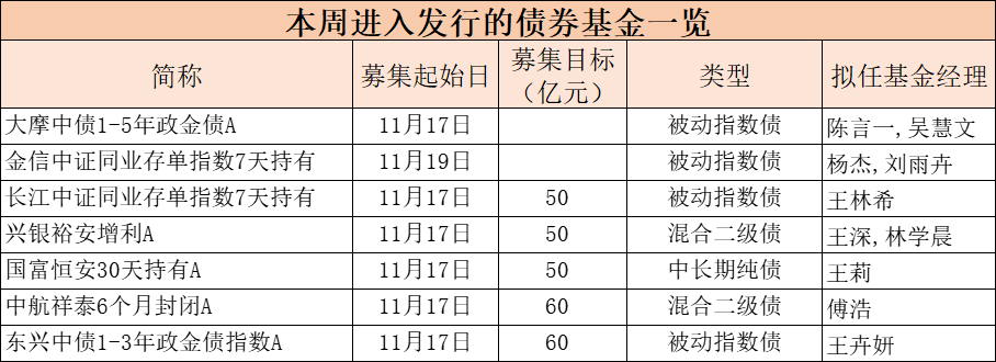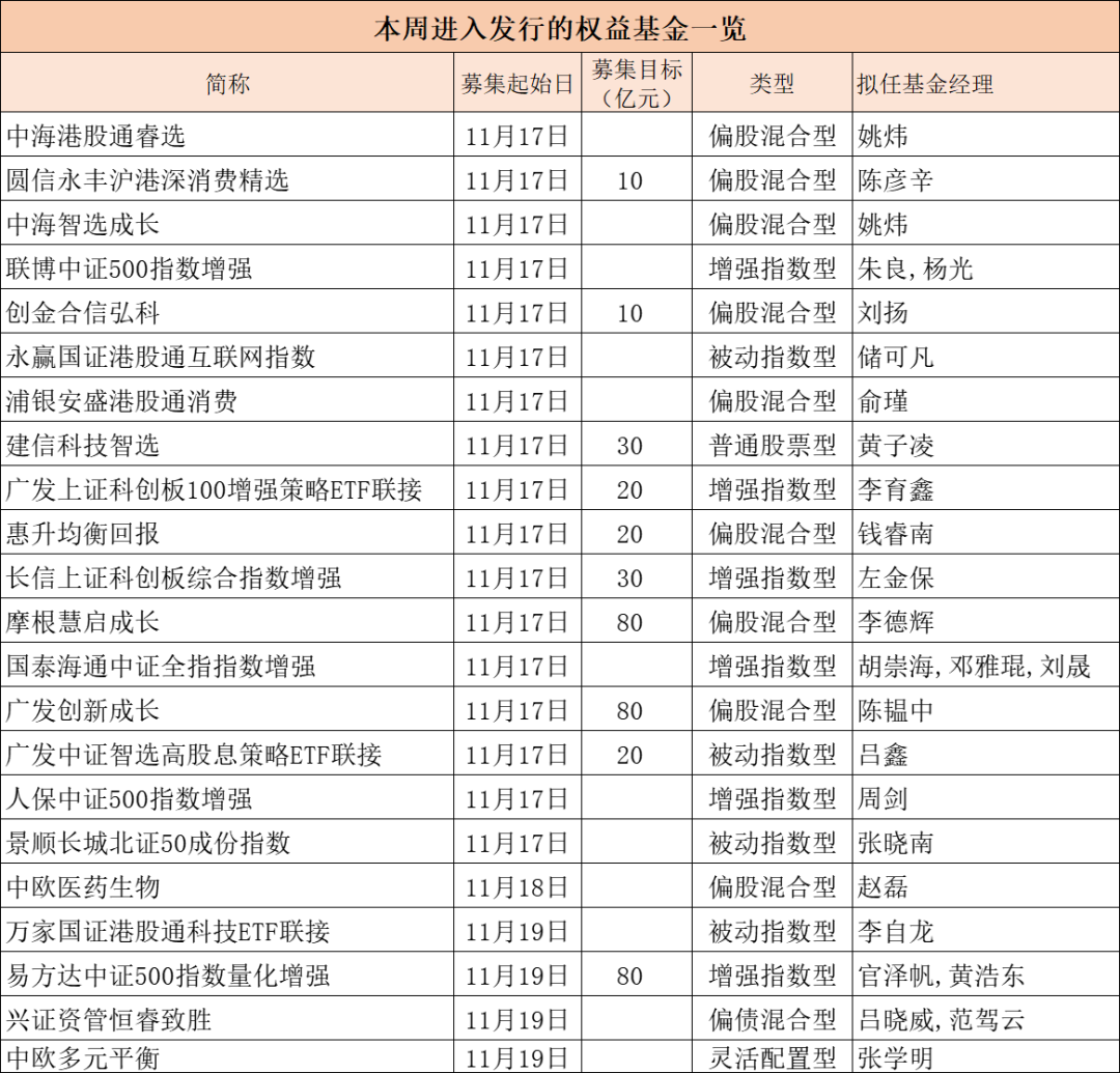 具體來看,周一(11月17日)本周33只新發基金中26只扎堆在周一開始發行,占本周新基金的78.79%;周二有1只新基金啟動募集,周三有6只基金開始認購。