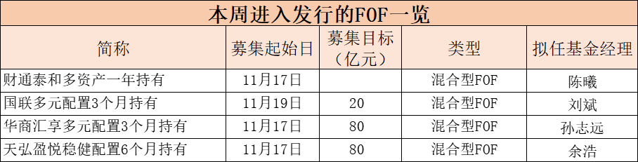 此外,本周有4只混合型FOF產品集體上架。今年以來,隨著權益市場企穩回升、投資者信心逐步恢復,FOF也明顯回暖,Wind數據顯示,截至10月31日,全市場成立滿6個月的477只FOF年內收益均為正,且平均收益率達14.29%。